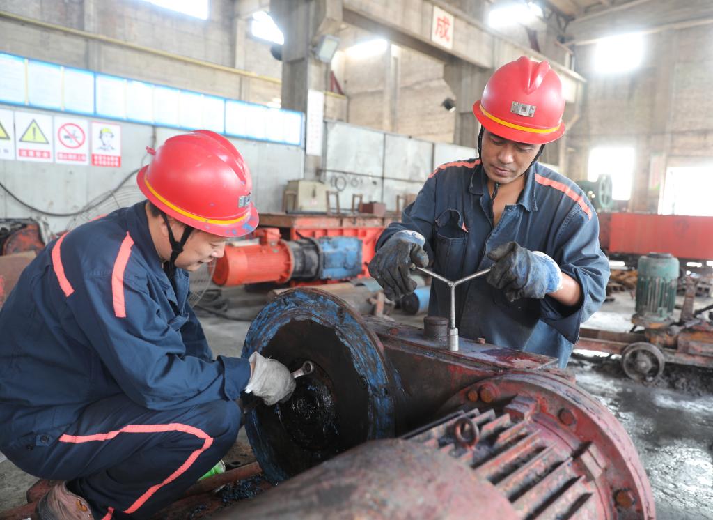機電科職工宋佳芳和張連玉正在維修耙矸機齒箱。“多修一臺設備,就能節省一點費用,也能為礦井修舊利廢工作出把力。”兩人堅定地表示。