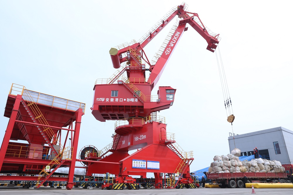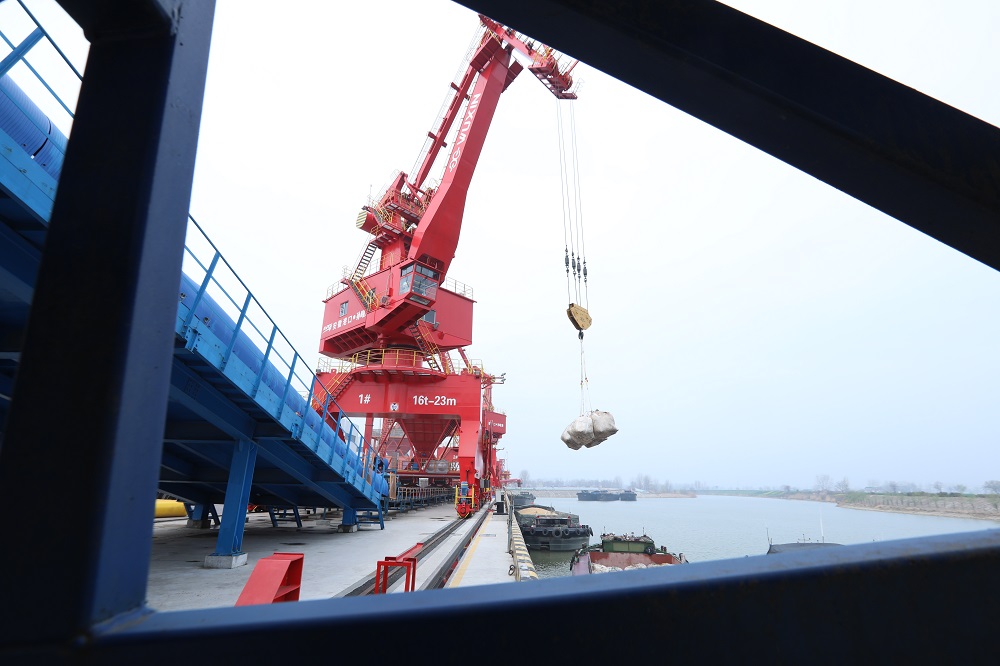 3月26日,記者來到淮北市濉溪縣孫疃港,現場起重機、多用途門機、移動式裝船機屹立在澮河岸邊正在吊運貨物,一派忙碌的景象。