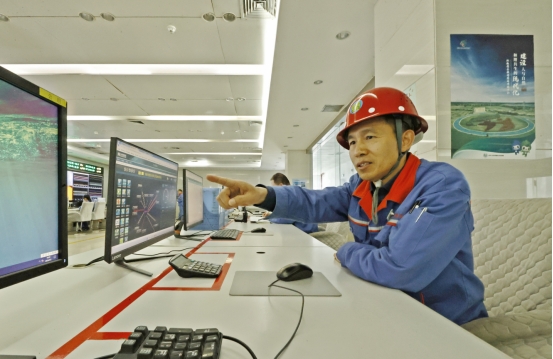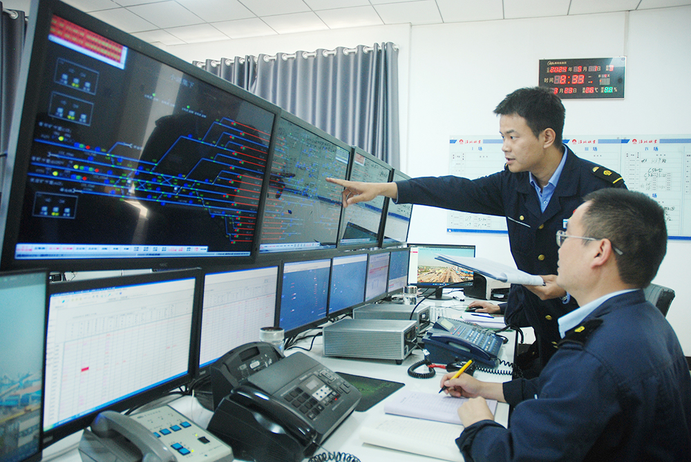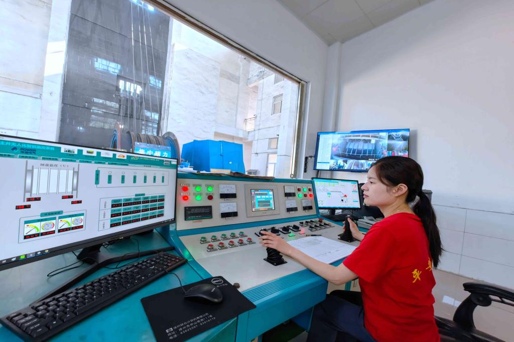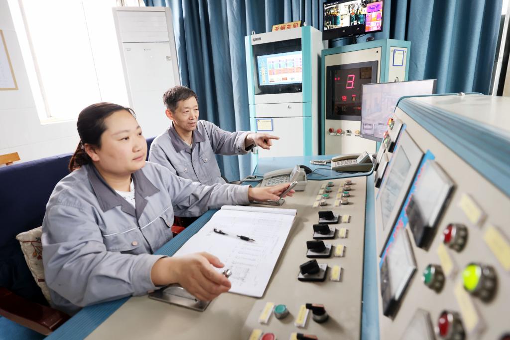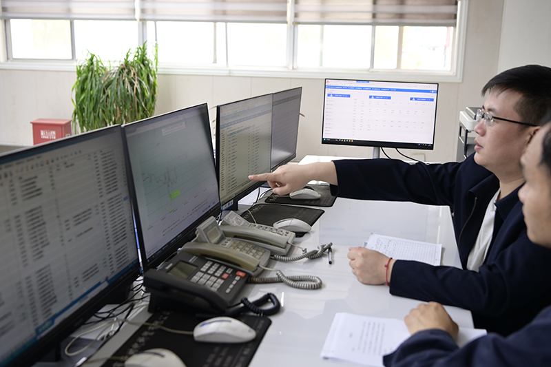 熱電分公司生產(chǎn)技術(shù)科科長(zhǎng)劉國(guó)中在中控室檢查生產(chǎn)數(shù)據(jù)。