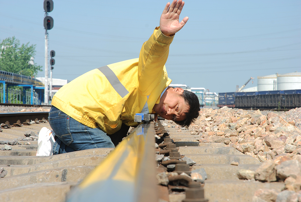 圖為線路工代福常進(jìn)行線路高低水平整治作業(yè)