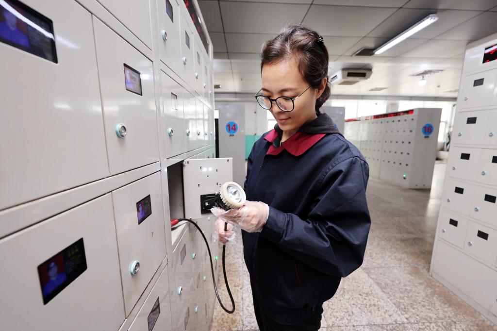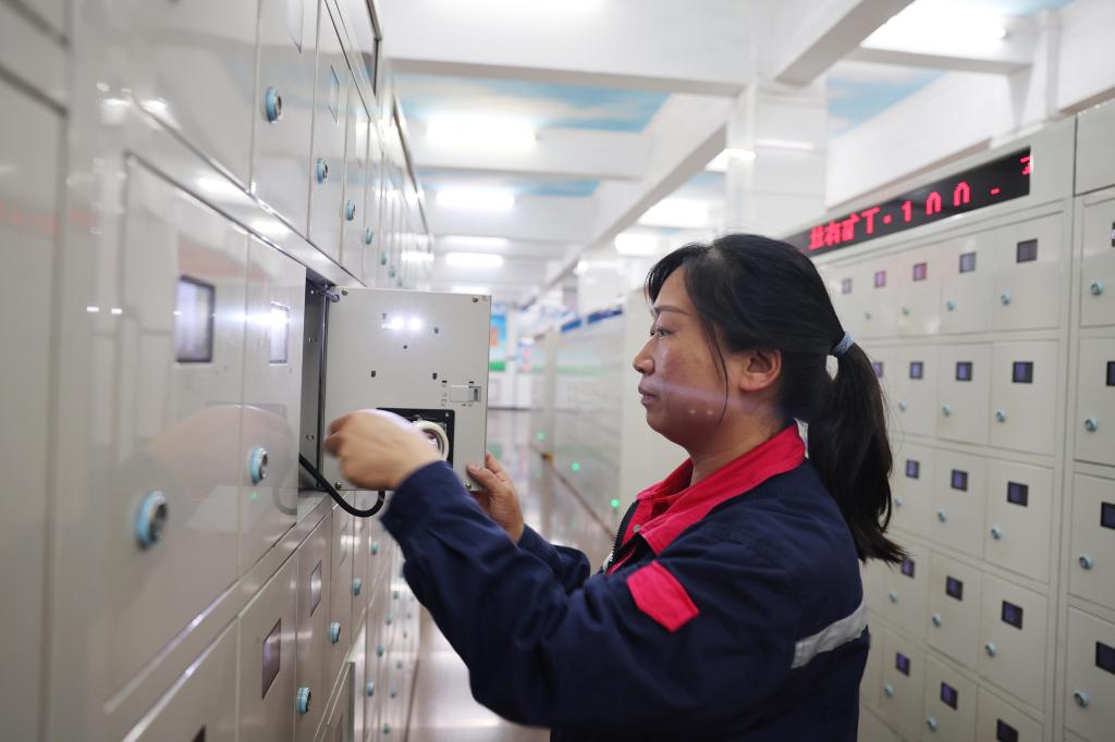 圖為該礦保運(yùn)區(qū)燈房女工王方正在檢查礦燈充電情況。