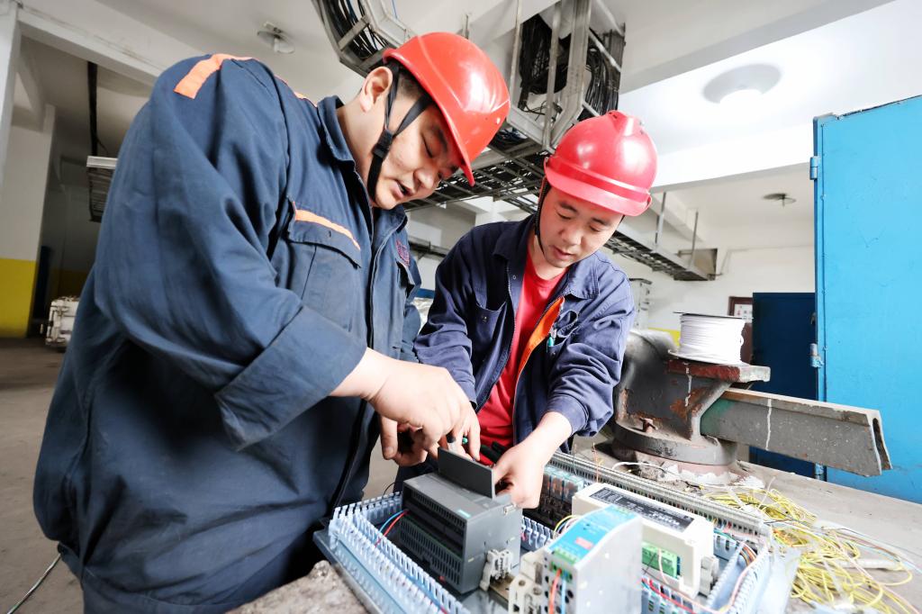 圖為機(jī)電科機(jī)修工王雷正在焊接電機(jī)