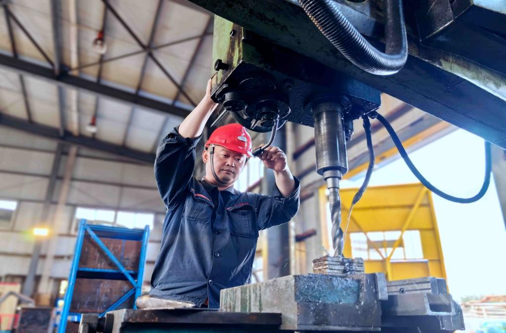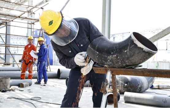 “十四五”專班PBAT項(xiàng)目一名工人在加工彎管。