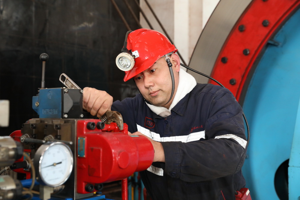 該礦保運(yùn)區(qū)職工王飛進(jìn)行提升液壓站日檢。