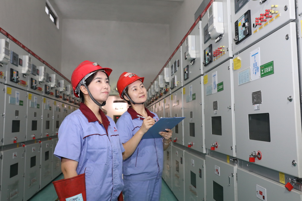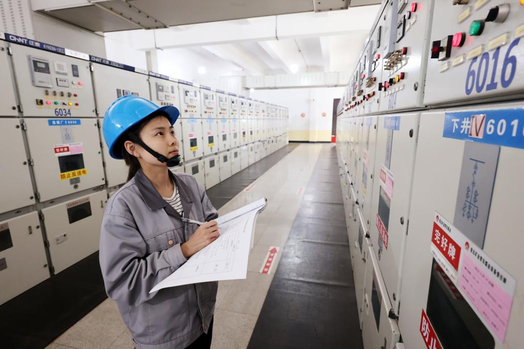 該礦保運(yùn)區(qū)35KV變電女工謝妍妍、張海玲進(jìn)行崗位操作。
