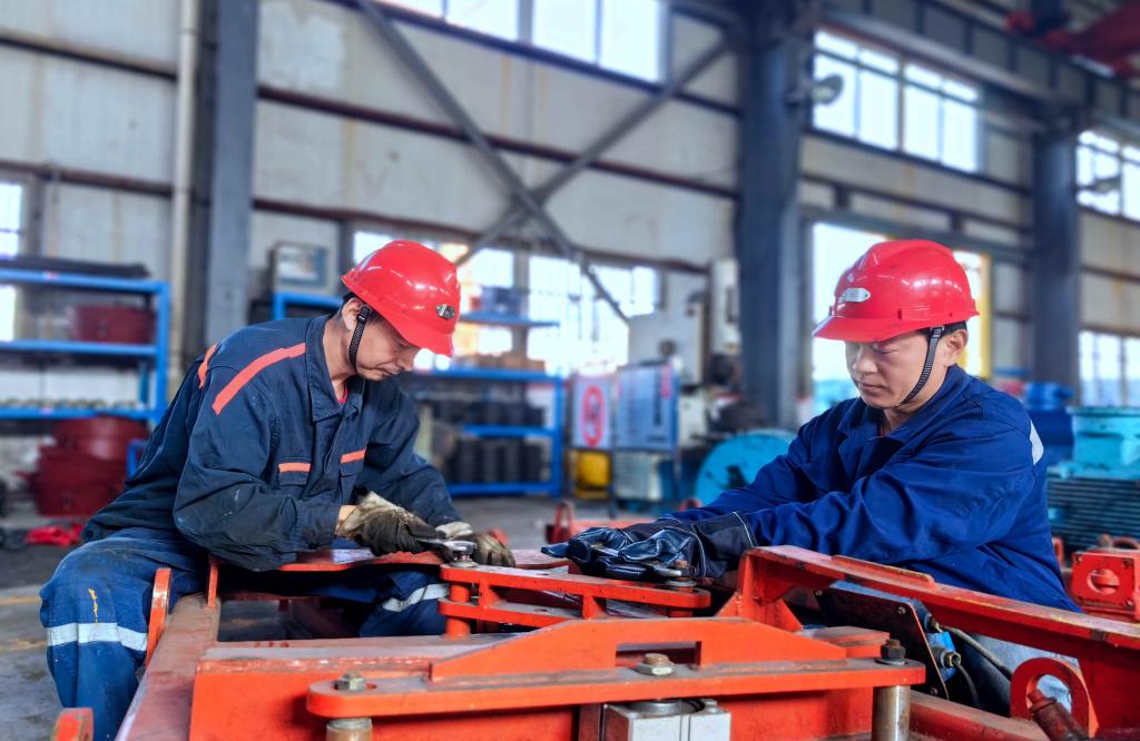 圖為機(jī)電科機(jī)修工胡天彬和戴鐵錘正在維修單軌吊氣動(dòng)道岔