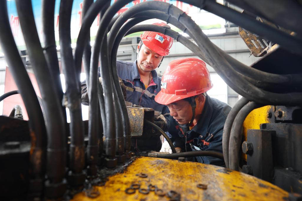 圖為該礦機(jī)電科(機(jī)廠)職工陳興開、徐輝正在維修井下挖掘機(jī)。