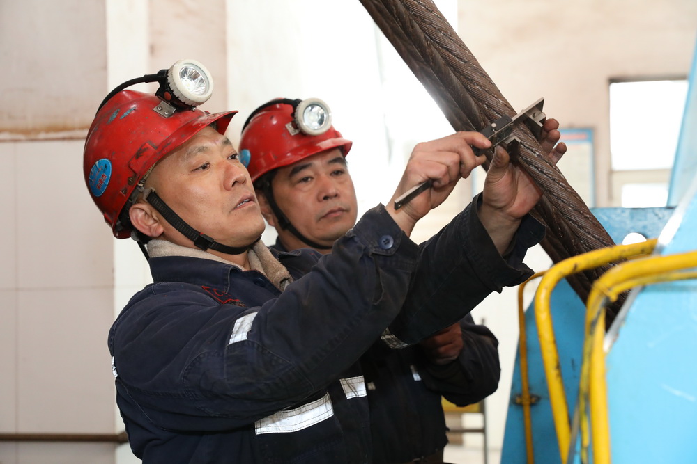 該礦保運(yùn)區(qū)職工宋清杰(左)與工友查驗(yàn)主提升鋼絲繩。